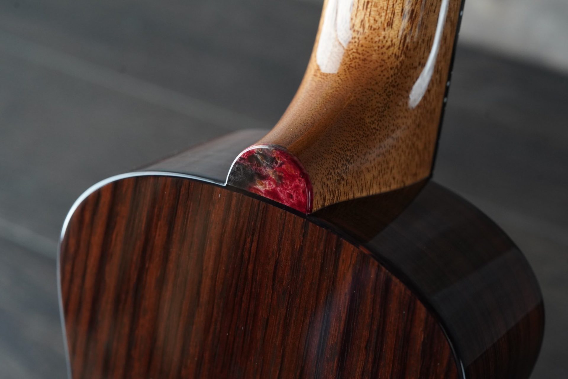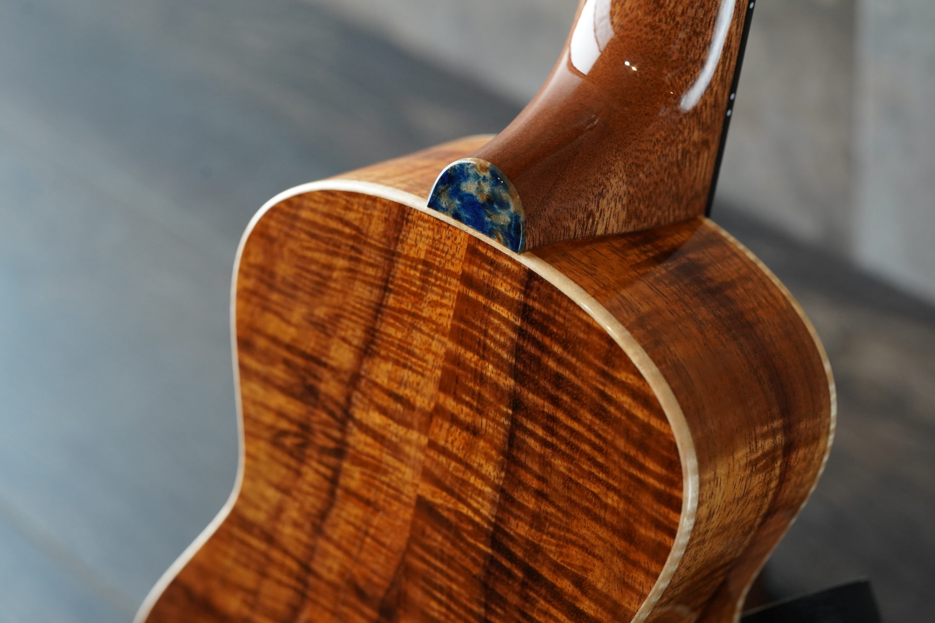 14フレットジョイントとなっており、様々なプレイスタイルに対応しています。深い青色のバール(瘤)材をヘッド・ロゼッタに標準採用しています。